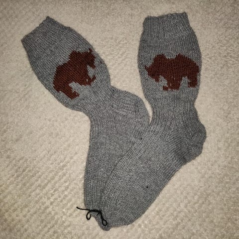 Harmaat käsin neulotut villasukat nro 45, varsissa pupujussit
