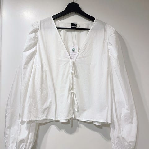 Gina Tricot. Kokomerkintä L. 100% puuvillaa ja siis ns. vaalea kulutuspesu "farkkukangasta". Takaa auki, nauhasuljenta, kauniit puhvihihat. Pesty, huonosti silitetty. Kerran pari käytetty (näkyy pesulapustakin!). Olka-helma n.93cm, kai-kai n.54cm, taitoskohta mistä alkaa tuo frillahelma n.48cm, kainalo-hihansuu n.15cm. Mallinukke 36/S kokoa (rinta 87/vyötärö 67). Ei sovituksia, ei toridiiliä, en tingi. Nouto tarkka aika etukäteen sovitusti ma-pe kl.10-16 Hki88 tai postitse pakettina.