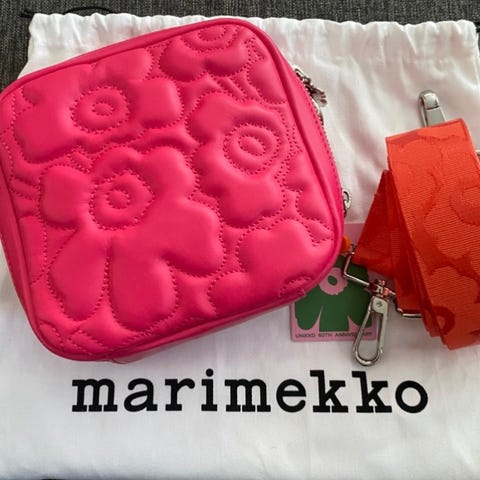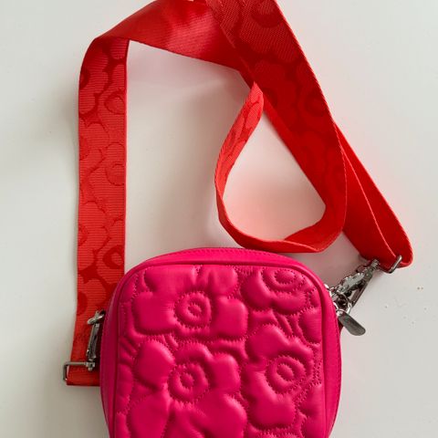 Marimekko Baby Gratha värinä viininpunainen mustalla unikko hihnalla.