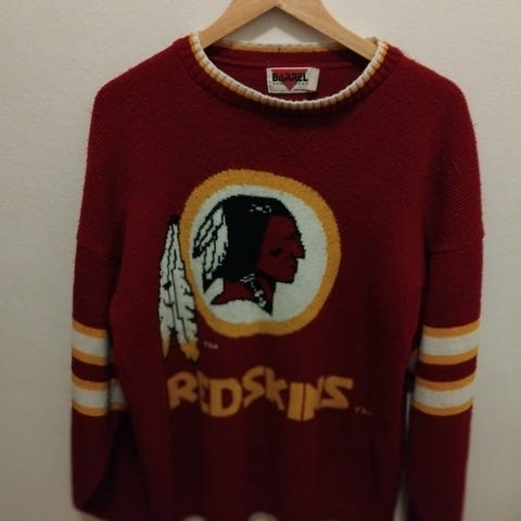 Washington Redskins:in aito pelipaita 90-luvulta. Kooksi ilmoittaa "one size fits all", mutta oikeasti koko on moderni miesten M / L, etumitta kainalosta kainaloon on 56 cm. Siisti ja ehjä, painatuksessa hieman kulumaa, katso kuvat. Nouto tai toridiili. Katso myös muut myyntiartikkelini!