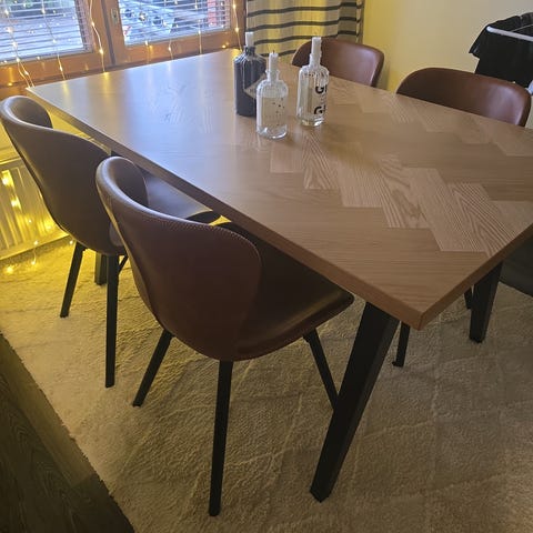 Upea ja upeassa kunnossa oleva ruokaryhmä. Väritys syvä mahonki. Jatkopala kiinteällä metallimekanismilla, helppo käyttää. Tuolit 4kpl, tukevat istua, verhoilut kestävää, silkkimäistä kangasta, siistit.