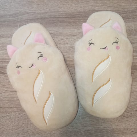 Nämä hassut hampurilaisen näköiset aamutossut on ostettu ennen joulua Tokmannilta. Käytetty vain pari kertaa. Todella pehmoiset ja lämpimät. Pohjissa pölyä.