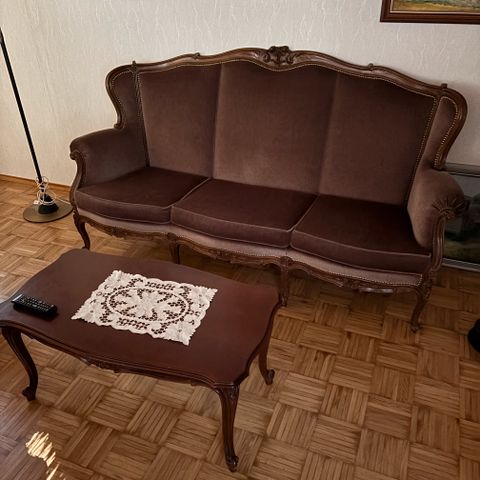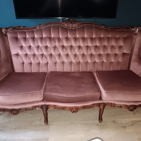 Kaunis uudemman tuotannon Rokokoo divaani myytävänä. Verhoilu paikka paikoin venähtänyt. Muutamia jälkiä kankaassa ja yksi tummempi kohta istuimessa. Rakenteeltaan ehjä ja tukeva. Ei hajuja.