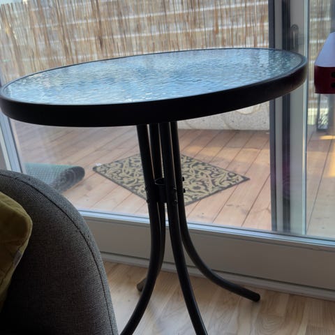 Vankka ja kaunis pyöreä pöytä lasikannella. Halkaisija 90 cm ja korkeus 49 cm. Nopea nouto Espoon Niipperistä.