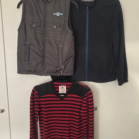 Poikien uusi harmaa toppaliivi vain kokeiltu hinta 10 euroa ja kuvassa näkyy saman koon raidallinen neulepusero annetaan ilmaiseksi!