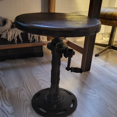 Vanha nostalginen pyöreä jakkara, joka on samalla esim. käsitöiden säilytyspaikka tai lehtisäilytyspaikka. Halkaisija 37 cm yläreunassa, korkeus 31 cm. Neljä jalkaa. Keskellä oleva vanerinen nappi on päällykseltään kulunut puhki, mutta siihen voi kiinnittää sopivan kangaspalan päälle. Alkuperäinen isoruutuinen ruskeasävyinen päällyskangas. Muuten ehjä ja siisti, tukevatekoinen. Postitus tai nouto.
