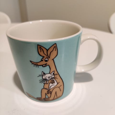 Turkoosi Nipsu muumimuki (Arabia Finland) kruunuleimalla. Tuotannosta poistunut muki (2008-2024). Uusi/käyttämätön, ei tarraa tai lappua.