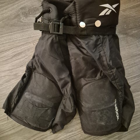 Myydään hyväkuntoiset Reebok jääkiekkohousut koko yth L, peffassa pieni reikä ei haittaa menoa.