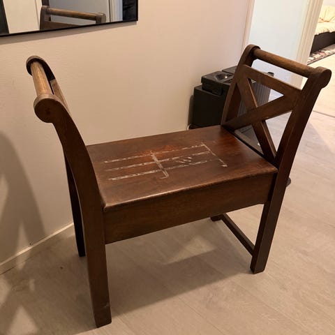 Mitat korkeus 65cm, leveys 65cm ja syvyys 45cm. Pieni kauneusvirhe penkissä pieni tahra jota ei ole koetettu irrottaa, helppo fiksata!