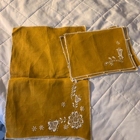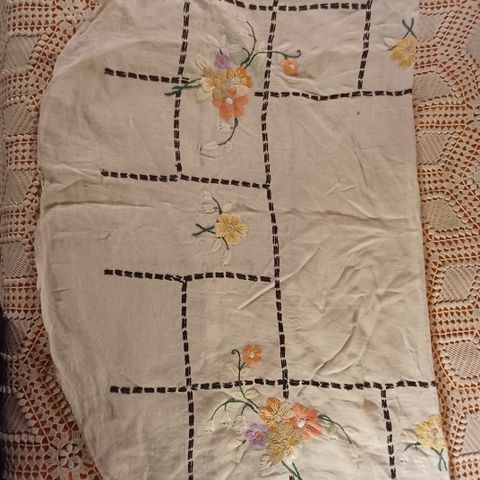 Iso pellavaliina pitsi reunassa, isot kukat kirjailtu.
