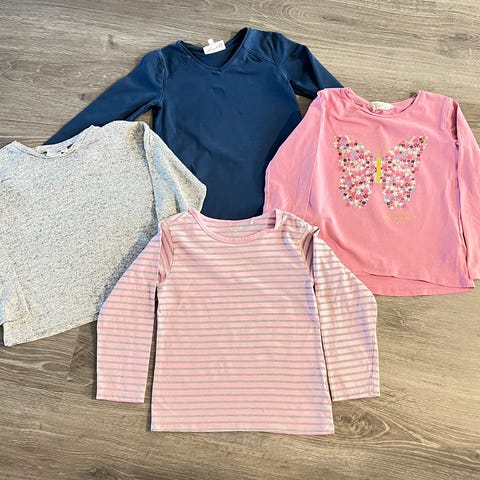 Gugguu lasten paita, koko 110 cm, vaaleanpunainen väri, tarkoitettu tytöille. Pitkähihainen paita, jossa koristeena kukkakoristeita. Materiaalista ei ole tietoa. Paita sisältää käytön jälkiä, kuten pieni tahra.