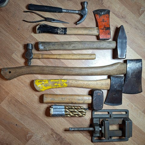 Ja lisää ois yksi iso kirves metalliputkivarrella noin 80luvulla tehty varsi.