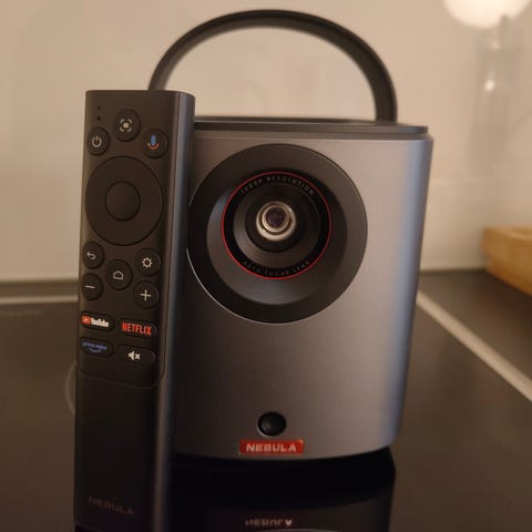 Nebula capsule 2 android projektori, mukaan myös kuljetuslaukku + laturi. Sekä aika heikkolaatuinen valkokangas.