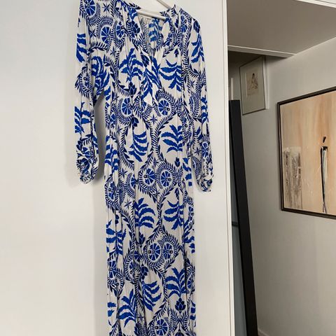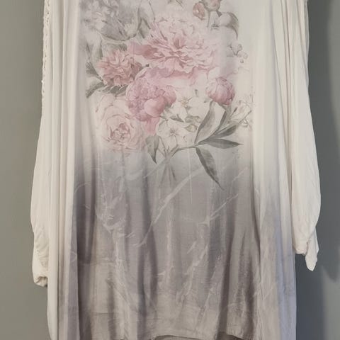 Kirkkaanpunainen kaftaani, jossa on kirjavia kukkakuvioita. Kevyttä ja ilmavaa materiaalia, vastaa kokoaan. Ylettyy takareisii asti 166 cm pituisella.