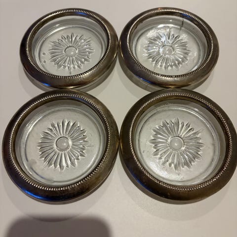 Myydään kauniit lasinaluset 6 kpl, alpakka. Leimat: MGAB, ALP alpakka. Halkaisija 8 cm. Lasinaluset ovat hyväkuntoiset, vähäistä käyttökulumaa.