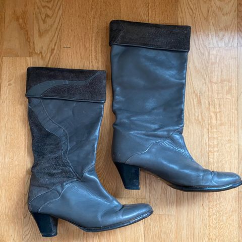 Italialaisen Neri Venezian upeat harmaat/hopeat nahkanilkkurit, todennäköisesti 2000-luvun alusta. Teddyn tapainen eläväpintainen karva, joka aavistuksen hohtaa. Kunto oikein hyvä, vetoketjut toimivat sujuvasti ja korkolapuissa tuskin kulumaa havaittavissa. Korko vajaa 7cm. Kokomerkintä 37 ja vastaa mielestäni hyvin kokoaan.