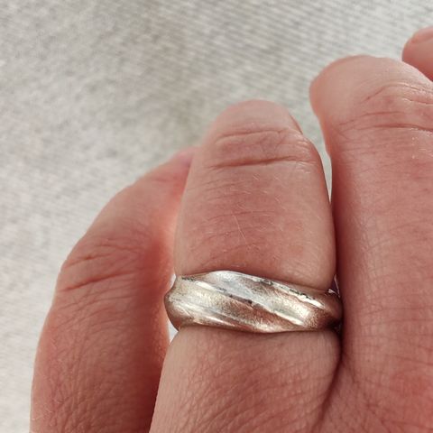 Hopeinen tosi hyvässä kunnossa oleva sormus, jossa jykevä kulmikas "laskostettu" etupuoli. Myös sormen ympäröivä osa leveä.