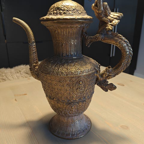 Tyylikäs, painava messinkiankka. Korkeys 35 cm, pituus 40 cm.