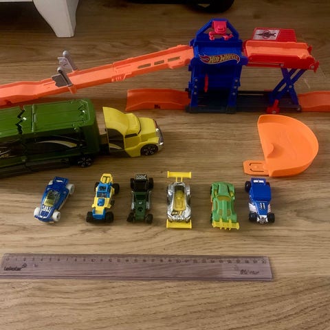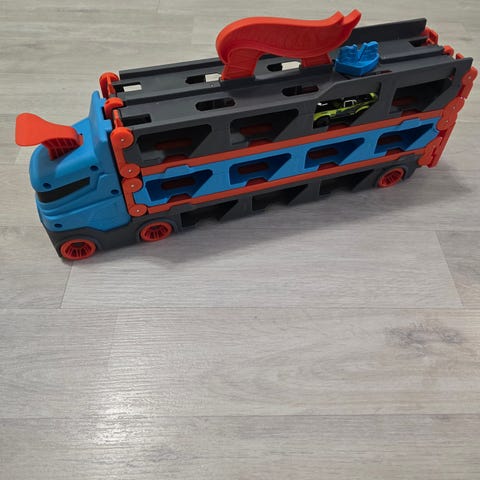Säilytä tai kuljeta vaikka 20 Hot Wheels -autoa kerralla tällä upealla rekalla. Avaa rekka ja edessäsi on upea, lähes 2 m pitkä rata, jolla voit kisata rinta rinnan kaverisi kanssa. Kumman auto kiitää voittoon? Pakkauksessa rekka ja 3 HW -autoa. 4+