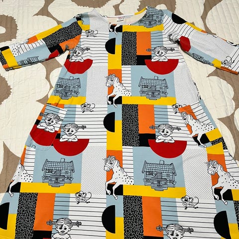 Iloisen monivärinen Peppi-mallistoomme kuuluva mekko, jossa on taskut, ¾-hihat ja suloisia yksityiskohtia. Mekon kuosia kuvittaa elämäniloinen Peppi Pitkätossu yhdessä eläinystäviensä kanssa.