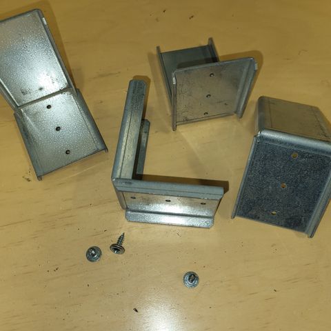 Myydään neljä C-muotoista metalliosaa. Uudet osat purettu kahdesta pakkauspussista kuvausta ja tarkistusta varten. Mukana seisemän 5x12mm poraruuvia. Kuvista puuttuu yksi ruuvi. Kahdeksas ruuvi oli valmistusvirheellinen ja tuli heitetty pois.