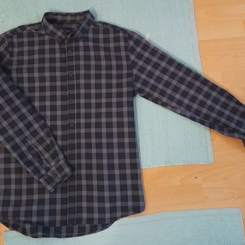 Sini-valko ruudullinen paitapusero koko L. Ihan pientä ruutua. Puseron koko kuvissa se näyttää hassulta, katso kangas lähikuvista. Ostettu uutena H&M, käytetty, mutta ok kunnossa jatkokäyttöön.