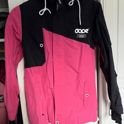 DOPE-merkkinen laskettelu-/lumilautailutakki, koko S. Takissa on camo-tyylinen kuviointi, ja väreinä ovat vaaleanpunainen, musta, harmaa ja valkoinen.