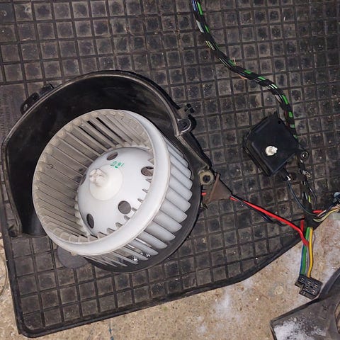 Uusi lämmityslaitteen puhallin Astra-G. Autot Behrin lämmityslaitteella, yleensä ilmastoidut, mutta näissä ei käytännössä näe puhallinversiota muuten kuin vanhan puhaltimen irroittamalla. Tätä on myös joissain Zafira-A malleissa, mutta harvoin.