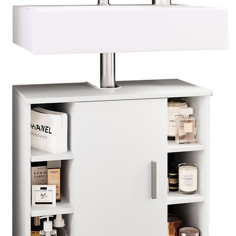 Kohokohdat: - Mitat n. K. 55 x L. 60 x S. 30 cm - Vakaa ja hyvä työstö - Kolme avointa lokeroa - Yksi pyörivä ovi ja yksi suuri lokero Ajattoman ja yksinkertaisen muotoilunsa ansiosta VCM:n pesualtaan alakaappi "Zalo L" on kaunis katseenvangitsija kaikissa kylpyhuoneissa. Melamiinipinnoitteinen allaskaappi on erityisen helppo puhdistaa ja kestää kosteutta. Alakaappi voidaan yhdistää muihin "VCM Zalo" -sarjan kylpyhuonekalusteisiin.