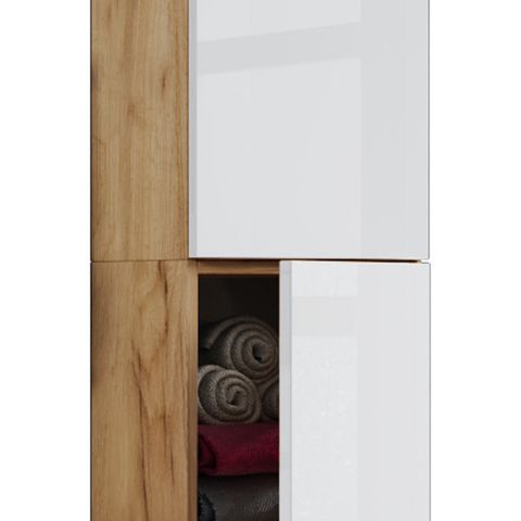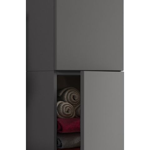 Kohokohdat: - 2 suurta ovea - Runko on valmistettu kestävästä ja epäherkästä melamiinista - 2 hyllyä ovien takana täydellisen järjestyksen takaamiseksi - Mitat n. K. 150 x L. 33 x S. 22 cm Push-to-open-toiminto on hiljainen ja tyylikäs vaihtoehto perinteisille kahvoille. Korkean kaapin runko on valmistettu melamiinista, ja siinä on erityisen helppohoitoinen ja epäherkkä pinta, joka kestää erinomaisesti kosteutta. Jokaisen pyöröoven takana on hylly täydellistä jakoa varten.