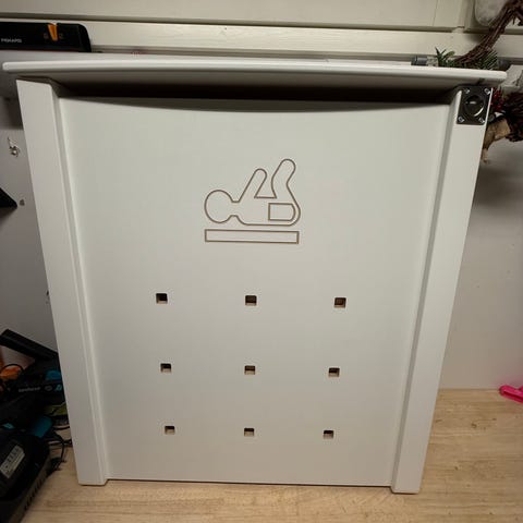 Tyylikäs seinään kiinnitettävä hoitopöytä ja "vaippasäilytysjuttu". Mukana kaksi pehmustetta, vihreä ja valkoinen. Joitakin käytön jälkiä.
