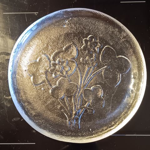 Kuvan mukainen vintage lasilautanen. Humppilan Heiniä Kainalossa. Halkaisija noin 24cm.