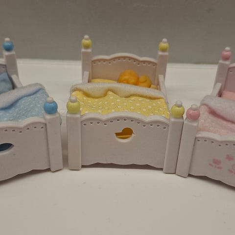 Sylvanian Families Kolmoiskerrossänky liukumäellä on viehättävä lisä Sylvanian Families -kokoelmaasi. Tämä huonekalusetti sisältää kolme pastellinsävyistä vauvansänkyä – vaaleanpunaisen, keltaisen ja sinisen – jotka voidaan pinota päällekkäin, asettaa vierekkäin tai järjestellä muilla tavoilla leikin monipuolistamiseksi. Jokaisessa sängyssä on yhteensopiva tyyny ja peitto, jotka lisäävät kodikkuutta nukkekodin lastenhuoneeseen.