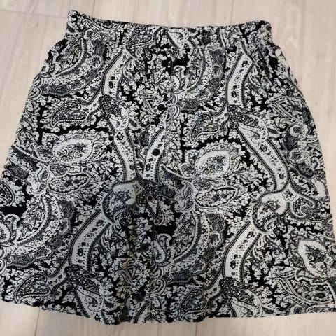 Vuorillinen Opalin sifonkihame. Koko M. Joustava vyötärö 86-106 cm. Pituus 86 cm. Mustalla pohjalla valkoisia ja punaisia kuvioita.