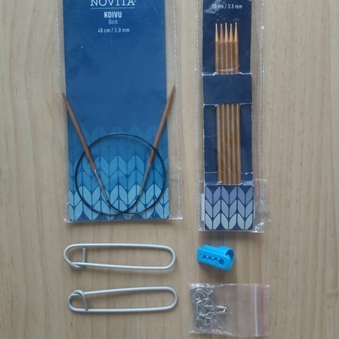Uusi vaaleanpunainen lanka ja vähällä käytöllä olleet neulepuikot.