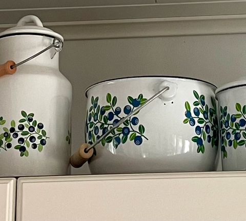 Mustikka emalipurkki. K 18cm, halkaisija 16cm.