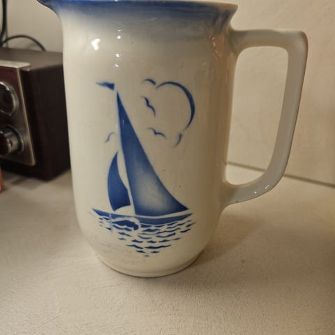Arabia purjevene kannu. Kaksi säröä korjattu liimalla. Vain nouto.