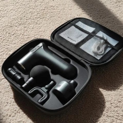 Uusi akkukäyttöinen hierontavasara 4 eri vaihtopäällä pakattuna omaan säilytyslaukkuun.