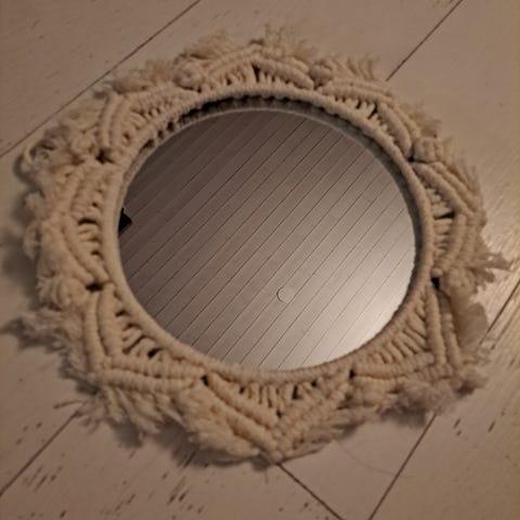 Käsityönä luonnonvalkoisesta puuvillalangasta tehty makramee kehys. Peili hieman tummempi savun sävyinen. Peilin halkaisija 20cm, kehyksen kanssa n.36cm. Tauluripustin kiinnitys.