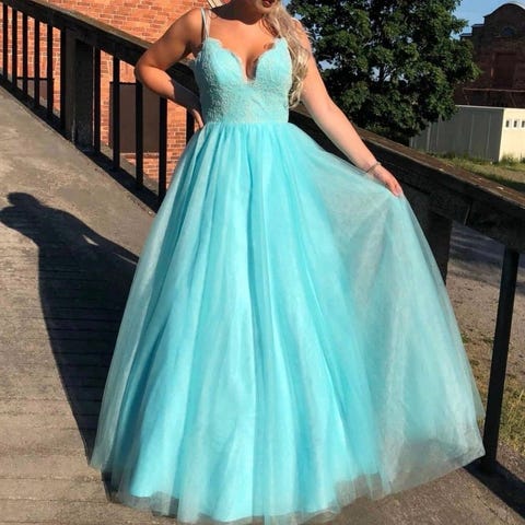 Kaunis vaalea mintunvärinen mekko. Kuvassa alusvanne ei kohdallaan, laskeutuu alemmas. Ollut 165cm pitkällä tytöllä kerran päällä.