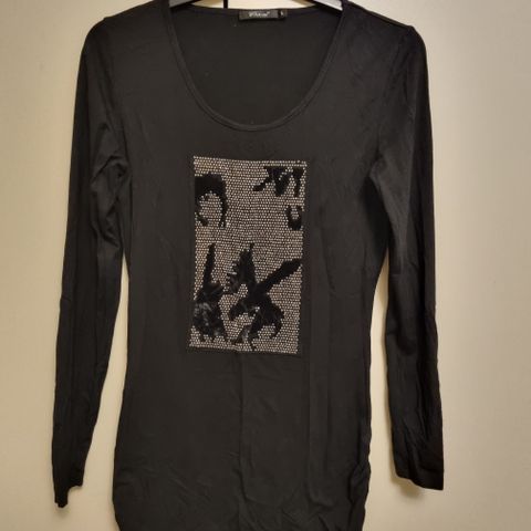 Musta, kuvan mukainen, erikoisella leikkauksella tehty pusero. Trikootyylinen. 90 % viskoosia, loput elastaania. Koko s, mutta on reilua kokoa.