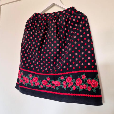 Sievä siisti essu vanhaa kukkakangasta. Ehkä 50-lukua? Esiliinassa edessä tasku ja alareunassa rimpsu.