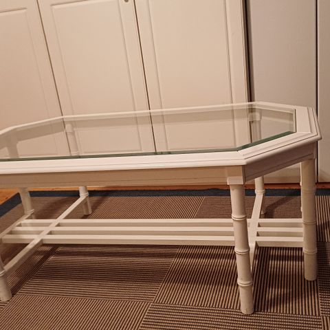 Tukevarakenteinen kuormalavoista tehty sohvapöytä, jossa pyörät alla. Pöytä maalattu valkoisella kalustemaalilla.