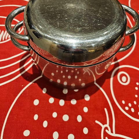 Kattila on kaksi osainen, kantta voidaan käyttää myös tarjoiluastiana.