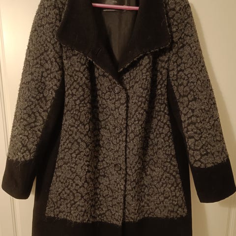 Todella hyväkuntoinen musta/harmaa villakangastakki. Takin materiaali 50%villaa 50%polyesteria, vuori 100% Polyesteria.