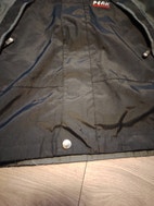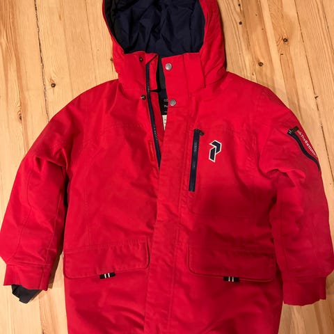 Peak Performance takki, koko M, vastaa kokoa 140-146. Ihan alhaalla nappilistassa pieni reikä. Muuten siisti. Pitää tuulta ja sadetta.