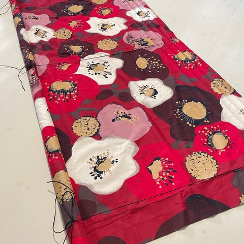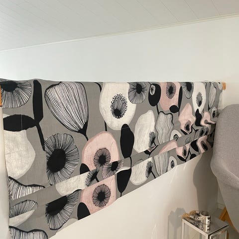 Myydään ompelemani verhokappa. Itse pidin verhon alaosassa kujassa muovista sähköputkea koko verhon leveydeltä, jolloin verho on ryhdikkään näköinen ja laskeutuu kauniisti. Ylhäällä tankokuja. Verho on ommeltu kahdesta palasta, kts. kuva, koska kankaan leveys ei olisi muuten riittänyt ikkunan leveydelle.
