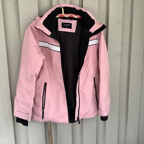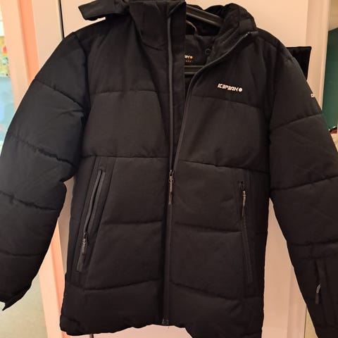 Musta toppatakki karvahupulla. Huppu irrotettavissa. 3 vetoketjutaskua edessä. Napeilla suljettava tuulilista. Siistikuntoinen. Koko 150. Koiratalous.