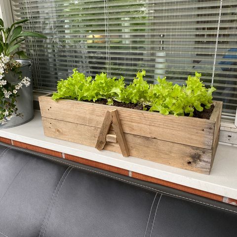 Istutuslaatikko 6-kulmainen. 20 cm korkea. Halk. n. 105cm. Maalattu kelonharmaalla puuöljyllä. Sivut ovat samanmittaisia (50cm) vaikka kuva vääristää. Kulkeutuu omien menojen mukaan Jyväskylän ja Tampereen suuntaan.