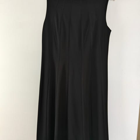 Mekko, pesty kerran. Keinonahka hihansuussa, pääntiessä ja lantiossa. Lantion leveys 47 cm. Koko mekko polvipituinen.